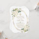 Elegant card design featuring watercolour delicate white flowers and green leaves, a faux gold cross and faux oval frame, floral divider, on a white background. On the back white flowers bouquet and cross. Use Personalise tool to add your info, change fonts, font's colours. For matching items, please, visit my New Baptism/Christening Celebration Collection.