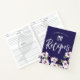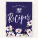 Floral recipe notebook printed with hand-drawn flowers in white and pink with greenery in green, and black and pink. Add your name in white letters against navy blue. Recipes is written across the floral recipe book in a charming white brush script.