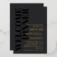 Elegant typography wedding welcome dinner invitation in charcoal grey with WELCOME DINNER in large black letters down the side of the invitation. Add names and invitation wording in gold foil. Gold foil and dark grey wedding welcome dinner invitation with your names in a large font.