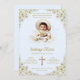 Celebra el bautizo de tu hijo con esta hermosa Invitación de Bautizo Charro, con un tierno niño vestido con un traje charro blanco y dorado. Con un fondo azul cielo suave, detalles dorados elegantes y una cruz católica clásica, es la combinación perfecta de tradición cultural y belleza espiritual.