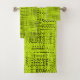 An abstract design in black and charcoal grey adorns a chartreuse background on this trendy bath towel set.