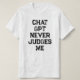 Chat GPT never judges me AI funny geeky nerdy T-Shirt. Looking for a hilarious way to showcase your love or hate for artificial intelligence? We have many AI-themed funny t-shirts! These shirts are the perfect blend of geeky tech humour and casual style. Whether you're a coding whiz, a machine learning enthusiast, or just someone who appreciates a good joke, AI funny t-shirts are here to make you laugh. With witty slogans like "Chat GPT is my best friend", "I'm not a robot, I'm just powered by AI" or "Artificial intelligence scares me". Wearing one of these shirts might spark some interesting conversations about the future of technology and AI.