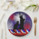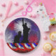 A silhouette of Théophile Steinlen's black cat for the Le Chat Noir club in a modern setting for the 4th of July. The cat is wearing a tricorne hat. The Statue of Liberty is in the background along with red, white, and blue fireworks.