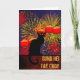 A silhouette of Théophile Steinlen's black cat for the Le Chat Noir club in a modern setting for the Chinese New Year featuring the black cat with red lanterns and gold and red fireworks."