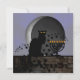 A silhouette of Théophile Steinlen's black cat for the Le Chat Noir club in a modern setting for Hanukkah/Chanukah featuring the black cat with a lit menorah and a waning moon.