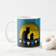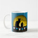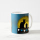 A silhouette of Théophile Steinlen's black cat for the Le Chat Noir club in a modern setting for Oktoberfest featuring a yellow moon, a beer stein, and decoration flags in Bavarian blue and white. The words "O'zapft is! Halt deine Lederhosen fest" translates to "It’s tapped!" Hold on to your Lederhosen."