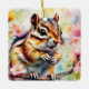 Talkative chipmunk sitting up on a small branch with its mouth open. Pink blossoms drift into a watercolor wash background.