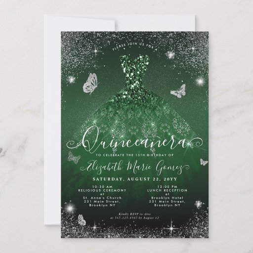 Floral Emerald Green Silver Grey Princess Gown Dress Glitter Sparkle 15th Birthday Photo Quinceanera Invitation
