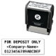 This simple rubber stamp design features the message "FOR DEPOSIT ONLY", along with a custom personal/business name and account number. It could be used by a clerical worker, an office clerical worker or an individual to efficiently add a restrictive endorsement to a check.