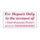 This basic rubber stamp design features the message "For Deposit Only to the account of", plus a customisable name and account number. It could be used by an accounting professional, a clerical worker or a financial clerk to efficiently add a restrictive indorsement to a check.