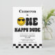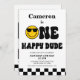 Simple and sweet one happy dude 1st birthday invitation for a baby boy featuring a yellow face and black glasses, retro style text and black and white checkerboard pattern. A photo appears on the back of the invitation.