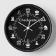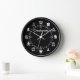 An elegant and simple chess inspired wall clock with graphic chess pieces representing the hour markers and chequered pattern indicating the minutes on a clean black background. The customisable text makes this time piece a great personalised gift idea for the chess playing enthusiast.