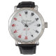 An elegant and simple chess inspired watch featuring red and black graphic chess pieces with hour and minute indicators on a clean white background. The customisable text makes this time piece a great personalised gift idea for the chess playing enthusiast.