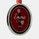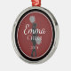 This ornament has a black shadow of a cheerleader with Grey-silver-like pompoms. Sample text of Emma, Cheer and your choice of date [shown 2019]. Colours shown are Deep Red, Grey Silver-like colour, White and Black. Nice choice for a spirit award or team medallion if you lengthen the ribbon or a nice keepsake ornament for your Christmas tree [which it is].