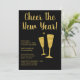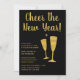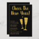 "Cheer the New Year" black gold fancy brushed typography script New Year's Eve party invitation with two golden glitter big champagne flutes and gold splashes. ----