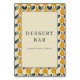 This charming wedding tabletop sign features a playful pear pattern surrounding a central beige rectangle, creating an inviting and cheerful atmosphere. The design showcases vibrant yellow-orange pears with dark green leaves on a white background, evoking a sense of nature and abundance. Elegant serif typography highlights the "Dessert Bar" text, encouraging guests to indulge in sweet treats. Perfect for adding a whimsical touch to your dessert station, this sign is ideal for enhancing the overall ambiance of your special day.