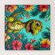 A vibrant illustration featuring a friendly cartoon dinosaur surrounded by colourful tropical flowers. The lush foliage and bright colours create a delightful and cheerful atmosphere. Perfect for children’s designs.