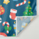 Cheerful multicolored Christmas pattern with santa, reindeers, elves, snowman, polar bear, presents, red and green bows, decorations, candy canes, red socks, etc.