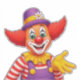 Vibrant cartoon clown with bright red hair, large green eyes and a wide smile. Wearing a purple hat with yellow band, yellow collar, and striped shirt, extending a friendly gesture.