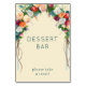 This wedding tabletop sign features a charming floral arch design with an array of colourful flowers and foliage, creating a vibrant and inviting atmosphere. The layout is balanced, with the text "DESSERT BAR" prominently displayed in a serif font, followed by "please take a treat!" in a simpler sans-serif style, both in a muted teal colour that contrasts beautifully against the cream background. The digital illustration technique gives it a polished and modern look, perfect for adding a touch of elegance to your celebration. Ideal for weddings or festive gatherings, this sign sets a cheerful and welcoming mood, encouraging guests to indulge in sweet treats.