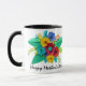 Cheerful Cut Paper Bouquet Mug - This cheerful mug features a vibrant and colourful paper flower bouquet, created using the art of origami and papercraft created by artificial intelligence. The intricate design showcases a beautiful arrangement of multicolored flowers and tropical leaves, reminiscent of a handmade paper craft. The nature-inspired design is a perfect blend of modern botanical and artistic paper sculpture, making it a unique and eye-catching addition to any room. Perfect for anyone who loves creative and decorative designs, this mug is a lovely way to enjoy your favourite beverages. The text says "Happy Mother's Day" but may be removed or edited as desired.