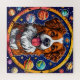 Cheerful dog with brown and white fur, prominently set against a vibrant background of outer space. The dog is centred in a circular frame decorated with colourful planets, stars, and other celestial elements. Its tongue is out, and it has a happy expression, giving it a playful personality. The combination of the dog and the cosmic theme creates a whimsical and imaginative atmosphere. The colours are bold and bright, enhancing the overall joyful vibe of the illustration.