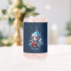Cheerful elf who shines with her long, flowing blue hair. Her hair seems to shimmer in the soft light, giving her a magical glow. On her head she wears a cute blue Christmas hat decorated with a white pompom that matches her outfit perfectly. Her warm smile radiates joy and warmth, giving viewers a sense of festive anticipation. The background of the design features stylised white Christmas trees, and the sky is dotted with sparkling white stars that shine like little diamonds, creating a magical atmosphere.