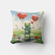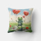 A cheerful animated frog stands on a rock holding three red heart-shaped balloons. The scene is set in a lush field dotted with red tulips, and a blue sky with fluffy clouds hangs above.