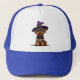 Colourful illustration of a happy dog sporting a purple witch hat, embodying the Halloween spirit. Ideal for seasonal designs, pet-related promotions, or whimsical holiday decorations.