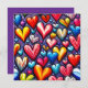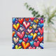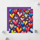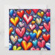 A vibrant and colourful array of hearts fills the scene, each varying in size and shade, against a dark background. The hearts display a mix of reds, blues, yellows, and pinks, creating a lively and cheerful atmosphere.