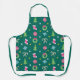 Christmas celebration pattern apron with Christmas tree, ball, candy cane, snowflake, wreath, garland, and sock elements.