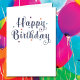 This popular Happy Birthday design is generic to suit any birthday celebration or greeting. Orange, green, purple, and blue dots around the cheerful Happy Birthday script.