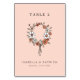 This wedding table card features a charming floral wreath design with white daisies, orange blossoms, and green leaves set against a soft peach background. The layout is balanced and symmetrical, with ample spacing that highlights the intricate botanical elements. A clean, sans-serif font is used for the customisable text, adding to the modern yet whimsical aesthetic. Perfect for an elegant celebration, this card exudes warmth and joy, making it ideal for marking special moments at your event.
