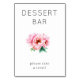 This wedding tabletop sign features a minimalist design with a clean white background, creating an elegant and inviting atmosphere. The centerpiece is a beautifully illustrated bouquet of soft pink peonies, rendered in a realistic yet stylized manner, accompanied by green leaves for contrast. Bold, uppercase typography announces "DESSERT BAR" at the top, while a gentle, lowercase phrase below invites guests to indulge with "please take a treat!" The overall mood is cheerful and romantic, perfect for enhancing any dessert station setup at your special event.