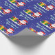 Cheerful Santa Claus cartoon with gift package Christmas Wrapping Paper. Cute Holiday design for friends and family. Personalized gift wrap for parents, kids and babies. Funny joyful illustration with for the winter season. Add your own name and custom seasons greetings like Merry Christmas or Happy Holidays. Customizable blue background color.