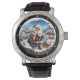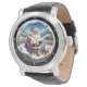 This vibrant watch face features a cheerful Santa Claus, giving a hearty thumbs-up in a picturesque snowy village. Cosy cottages with warm lights nestle among frosted pine trees, all set against a beautiful mountain backdrop under a bright sky. This artistic timepiece perfectly captures the joyous spirit of Christmas, making it a delightful decorative addition.