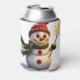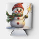 A festive snowman adorned with a red hat and scarf during a snowy winter.