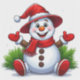 Smiling snowman wearing a red hat, scarf, and mittens, sitting in a snowy field against greenery. Perfect for Christmas, winter, and holiday-themed designs, capturing seasonal joy and festivity.