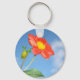 Personalised keychain. Bright and summery strawberry blossom flower against a bright blue summer sky.