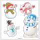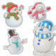 Four playful snowmen illustrations in bold, festive colours, each with hats, scarves, mittens and a broom or top hat. Great for holiday campaigns, winter scenes, greeting cards, and family-themed designs.