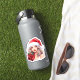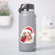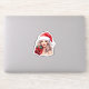 A vibrant design features a joyful woman wearing a classic red Santa hat, her wavy hair framing her face. She holds a beautifully wrapped gift adorned with festive decorations, capturing the warm spirit of Christmas celebrations and holiday joy.