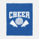 Fleece blanket is shown in a colour of royal blue with a white cheer pom print.