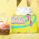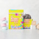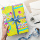 Cheerleader in pink outfit with pom poms. Happy Birthday text on bright yellow gift wrapping paper.