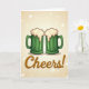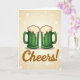 This greeting card shows two emerald-green beer mugs centered on a soft beige background, tilted slightly toward each other like close friends leaning in for a toast 💚. Each mug is filled to the top with creamy white foam that spills gently over the rim, adding a cozy, just-poured look. The glass bodies have neat vertical grooves that catch the light and give them a textured, polished feel. They sit side by side with a balanced, mirror-like layout that makes the clink feel shared and affectionate ☘️. Beneath the mugs, the word “Cheers!” is placed near the bottom in burnished gold lettering that curves smoothly across the space. A soft, diffused glow washes over the scene, with faint bokeh dots floating in the background like distant party lights. The foam is bright white with rounded edges, and the gold “Cheers!” sits clearly below the mugs against the warm beige field.