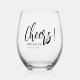 Raise a toast with elegance using this Stemless Wine Glass adorned with a beautiful black script typography design. The word 'Cheers' is elegantly written in cursive script, adding a touch of sophistication to your wedding celebration. Personalise this glass with the names of the happy couple and their special wedding date, creating a unique and memorable keepsake for years to come. Cheers to love, laughter, and a lifetime of happiness!