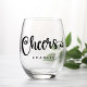Stemless wine glasses with black or custom colour text "Cheers" in a cute script font and your custom name below.