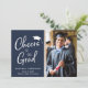Modern dark blue 2 photo graduation announcement card. The front features the graduate's photo, "Cheers to the Grad" in a modern white script, and a white illustration of grad cap. Easily personalise with the graduate's name and school, and add another photo on the back.