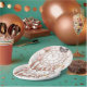 Glitzy glam for your New Year’s Eve party table! A large clock face with hands approaching midnight,, balloons, mask and champagne flutes and star motifs, with typography Cheers set to come off the page slightly In a faux glitter rose gold script.