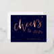 This modern and elegant happy new year postcard for 2024 features trendy rose gold foil script typography that says "cheers to 2024" on a dark navy blue background.