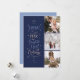 Cheers to the New year with this Dynamic and fun multi photo Holiday card. The Card text reads "Cheers to Another year of Laughter, Love, & Holiday Magic" Customise the Date, Family name, and paragraph of room on the back for a paragraph of text to share about your year. 3 Photos layout on front and a heart frame photo on back. Navy, and light blues and cream design.